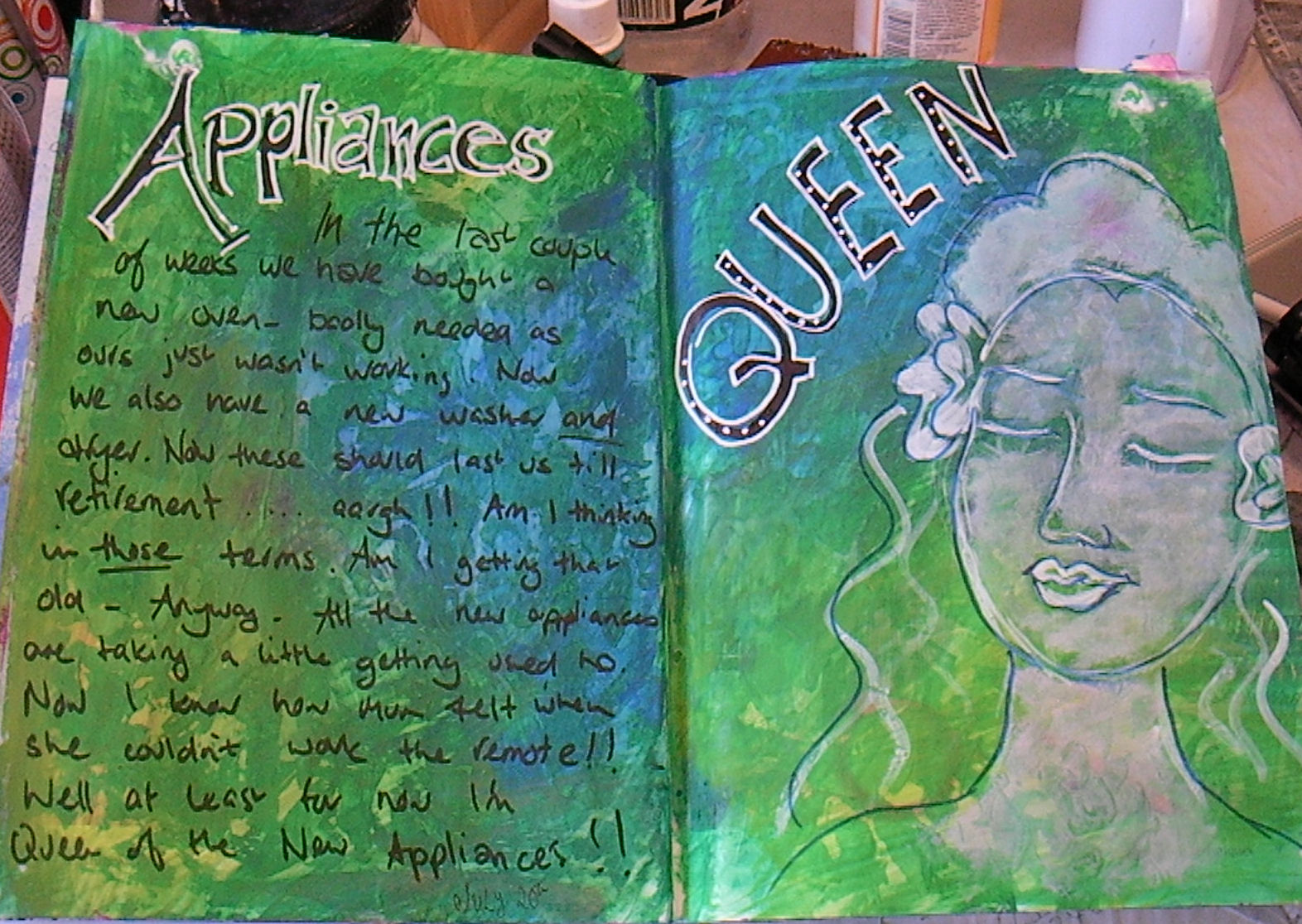 I've finished my first Book of Days journal. Perfectly timed to the 6 months mark, so now I have changed to a new, larger size book. There's lots more room to be creative, but it can also seem a little daunting to fill up the whole spread, though really great it you want to add a face! I'm liking what I've achieved so far...